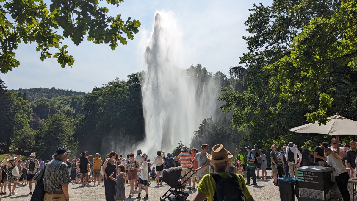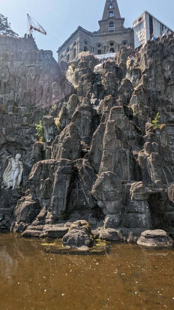 Gegen 14:30 Uhr beginnt dann das spektakuläre Naturschauspiel: Die Wasserspiele! Wie von Zauberhand geleitet, rauschen die Wasserfälle hinab, bis sich die Kraft des Wassers in der gewaltigen Fontäne des großen Springbrunnens entlädt – ein wahrhaft magischer Anblick, den man so schnell nicht vergisst.